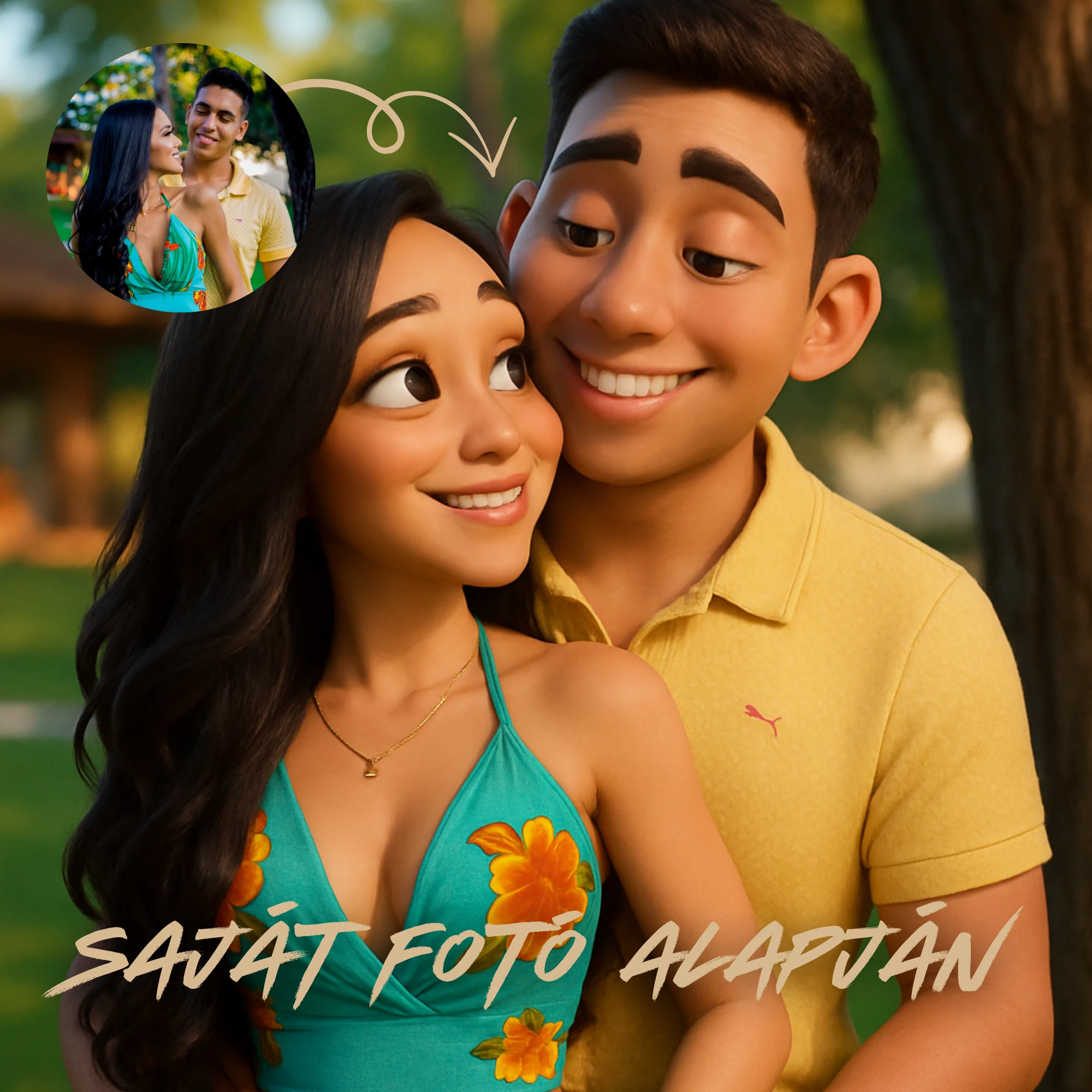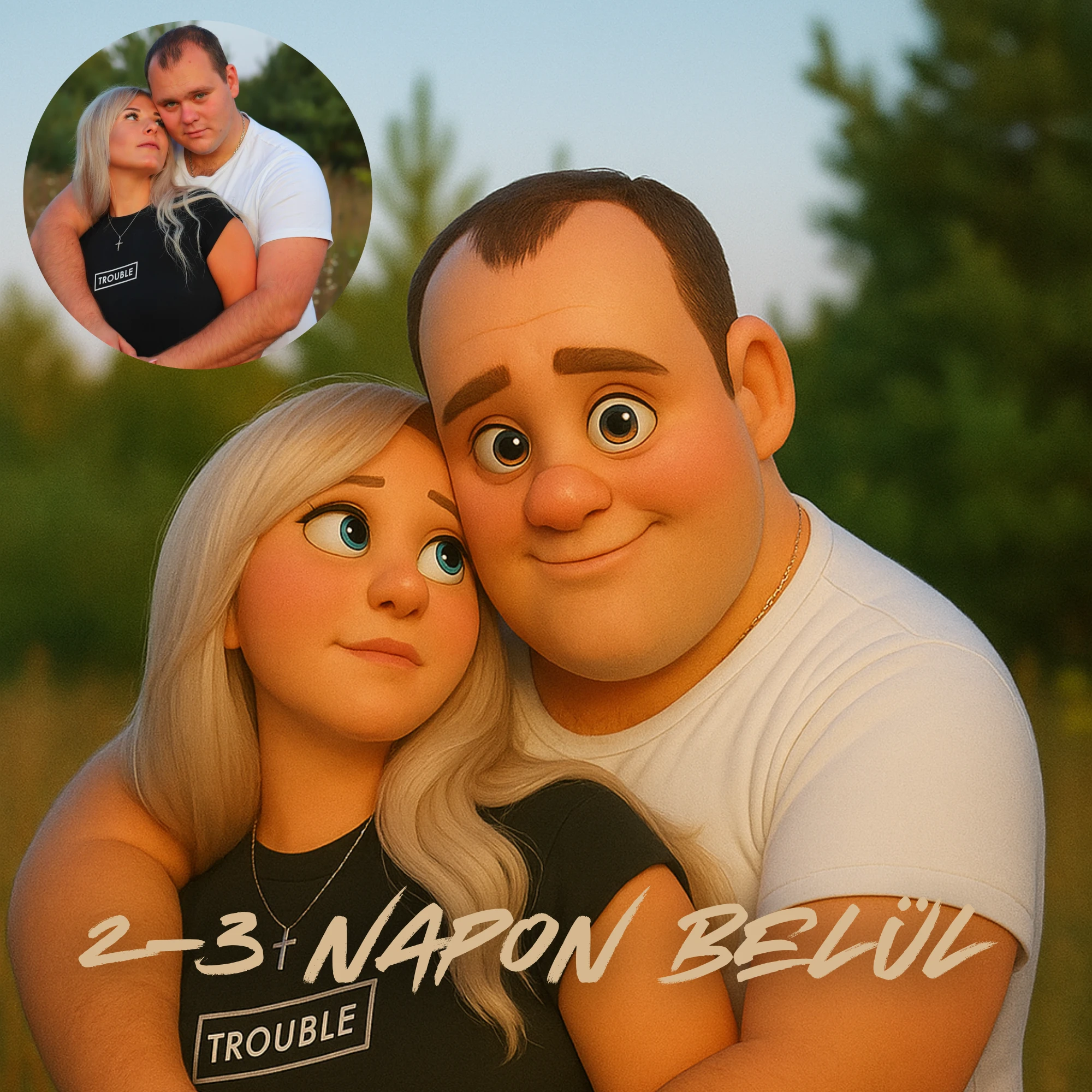 A feltöltött kép alapján egy modern, digitális illusztráció készül, amely megőrzi az arcok karakterét, mégis rajzolt, mesés hangulatot ad a végeredménynek.